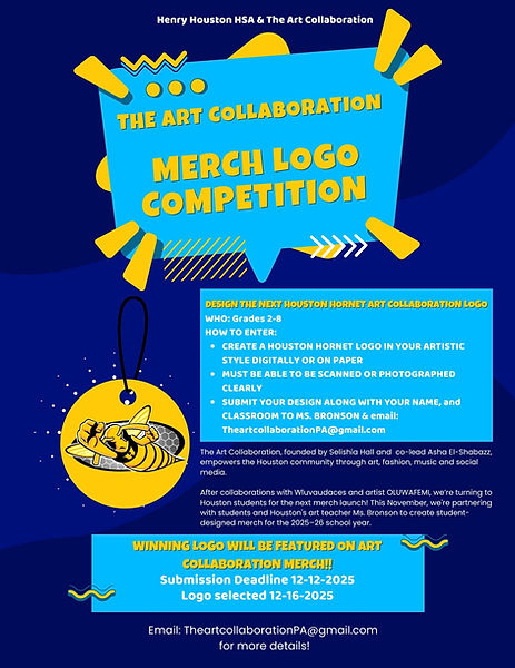 EXCITING NEWS...! The next collaboration will feature our very own Houston scholars! In partnership with Houston art teacher Ms Shaunia Bronson, the ART Collaboration team is bringing you a merch logo competition. Students in grades 2-8 can submit a design for a chance to have it featured on school swag until December 12th, 2025. Submit designs to theartcollaborationpa@gmail.com. And if you miss the deadline this year, don't worry, because the merch logo competition will happen annually!